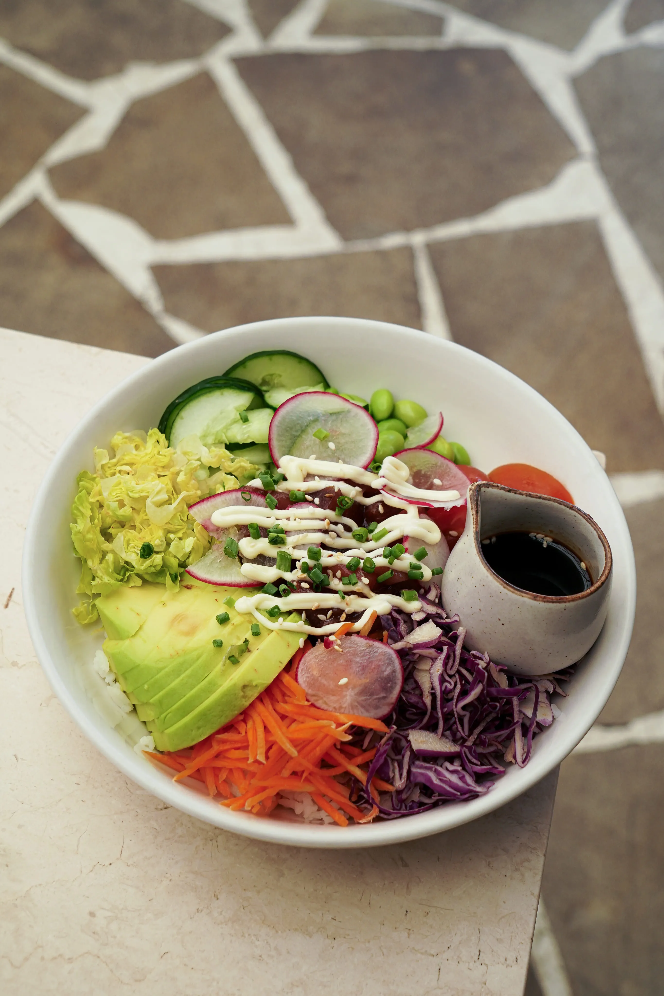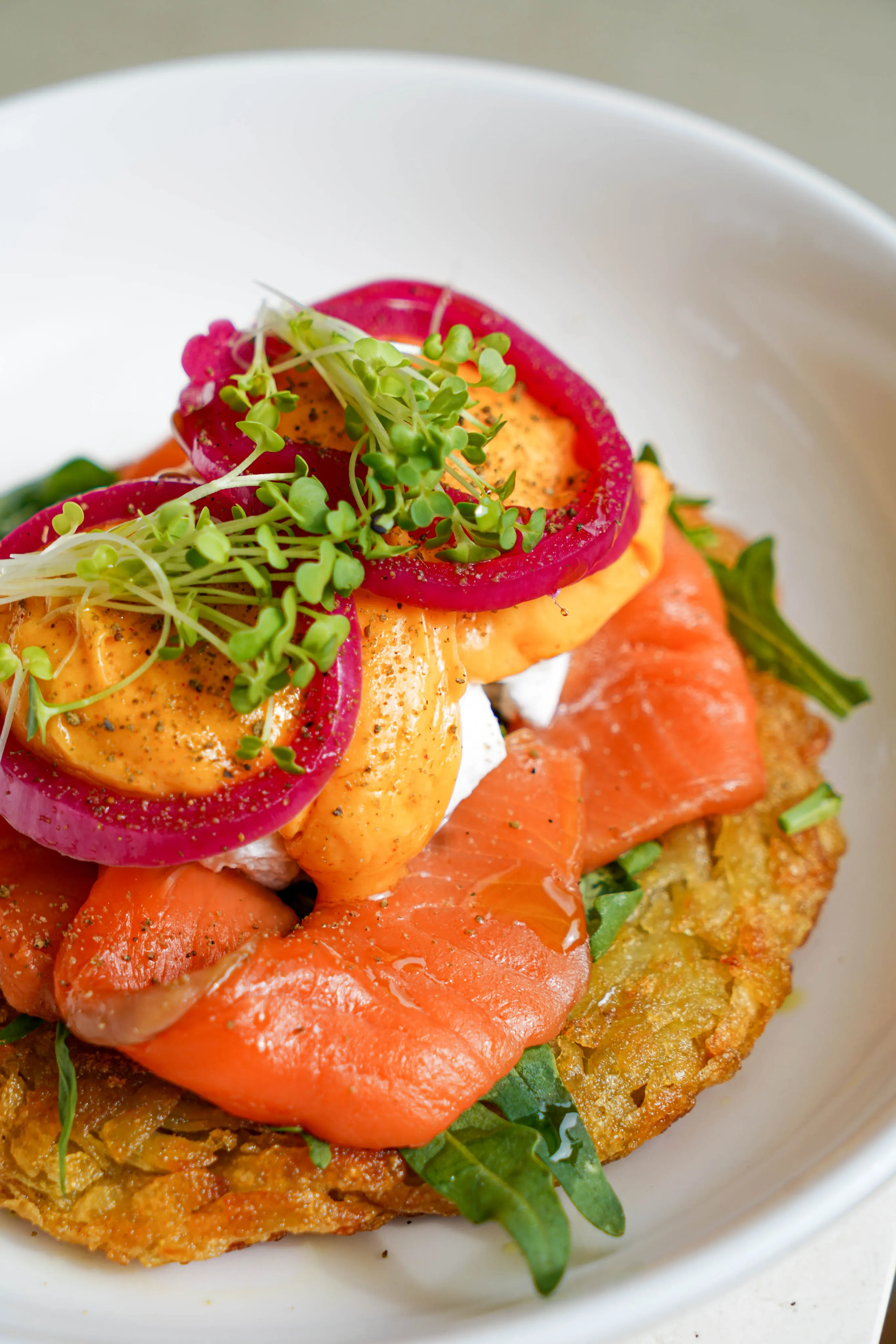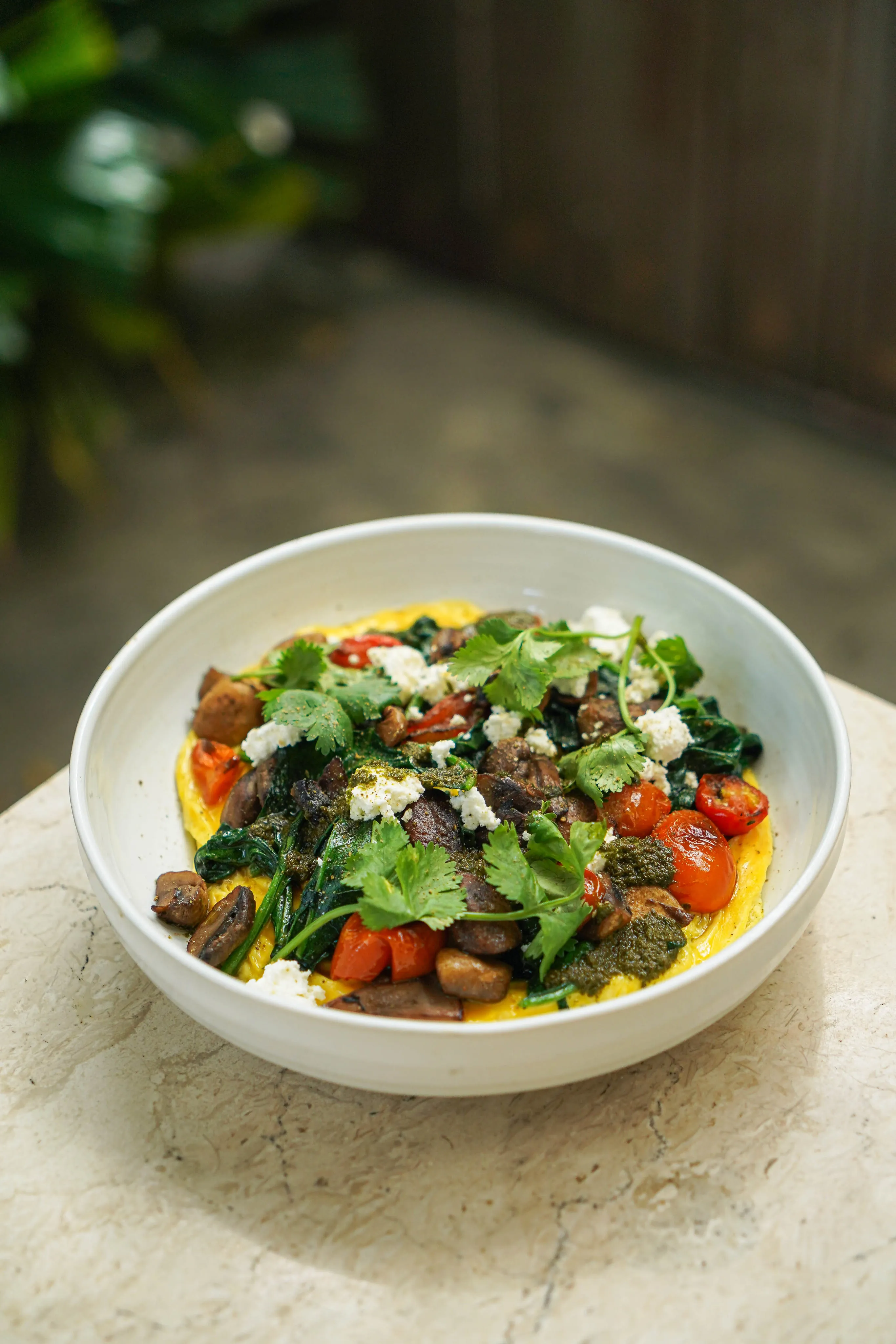Sourdough, creamy scramble eggs, herb mushrooms, truffle oil, garlic chips, spring onion, sour cream