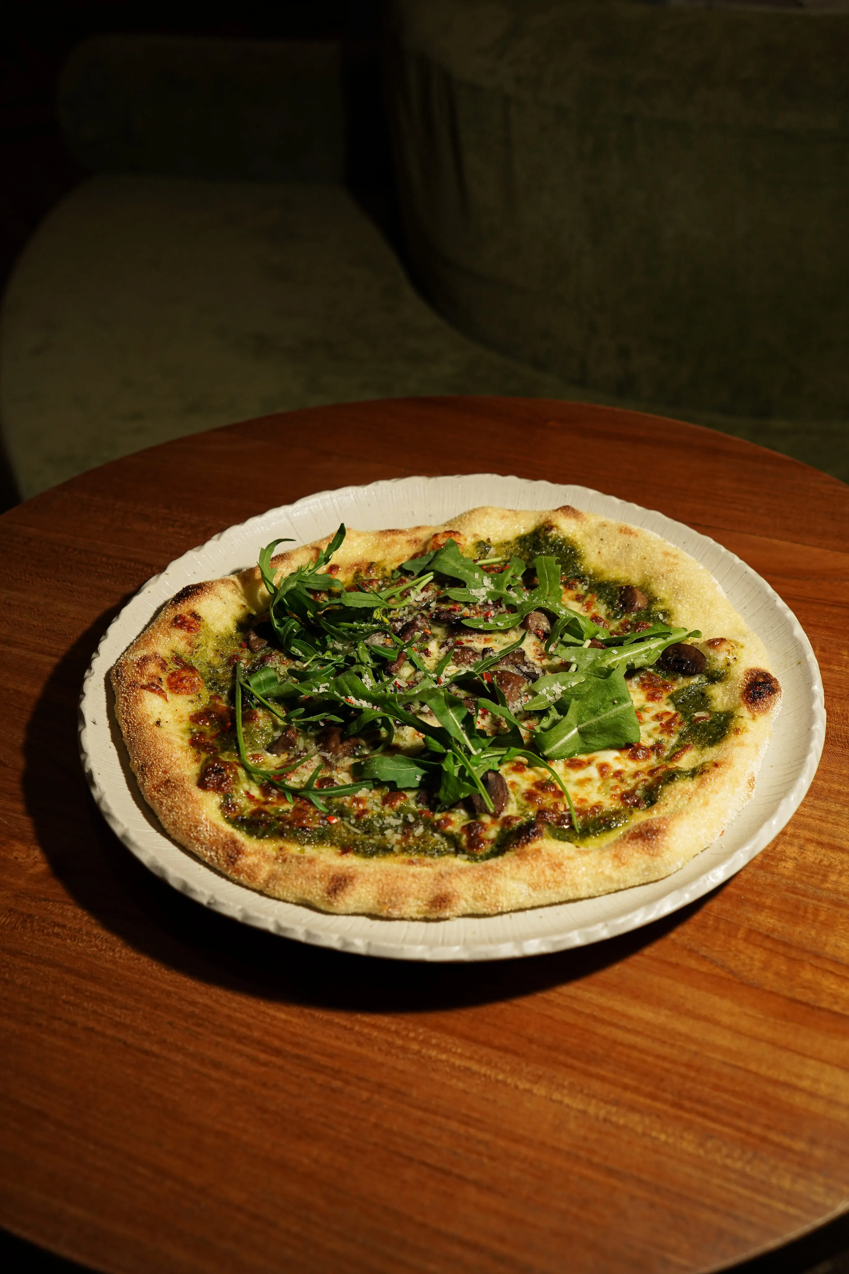 Mushroom, pesto, wild rocket, chilli flakes, parmesan cheese, mozzarella