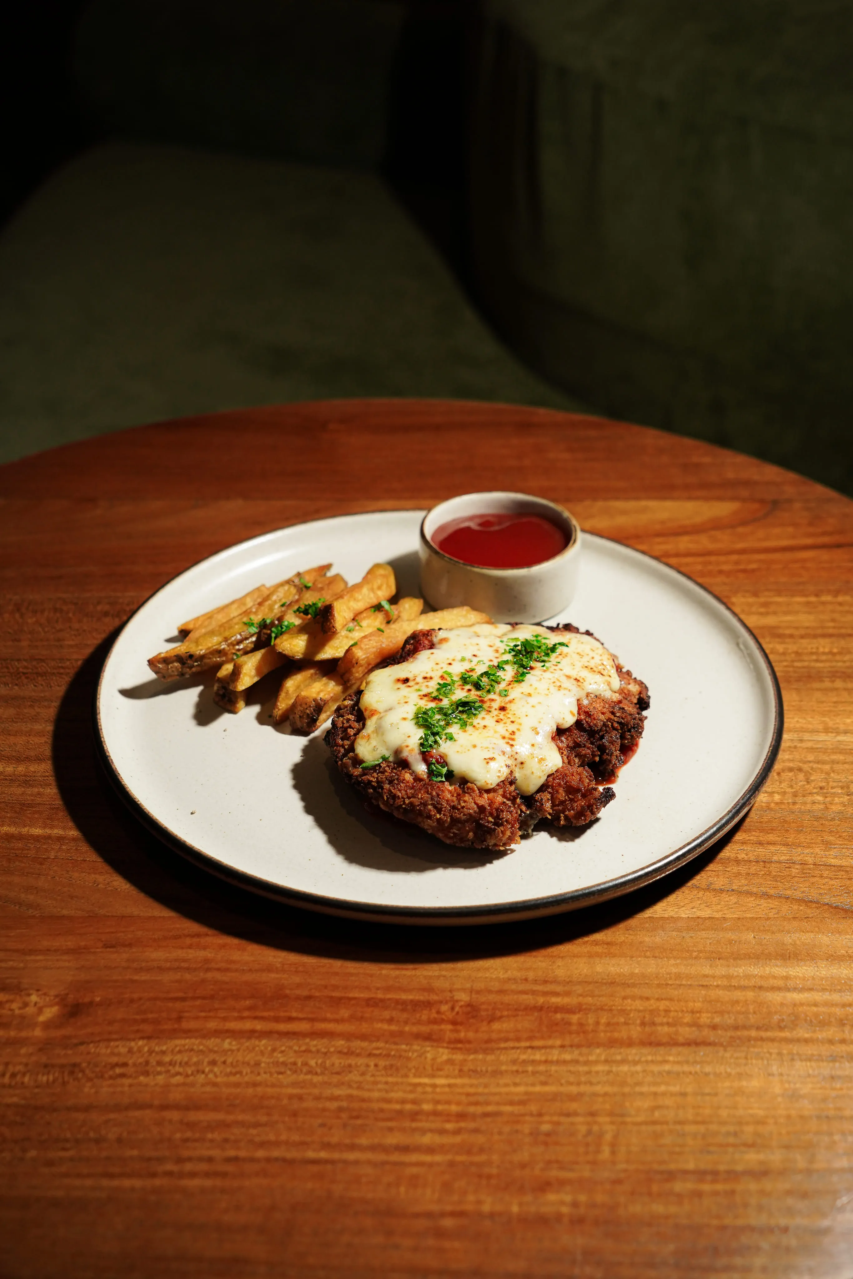 Breaded chicken breast, tomato sauce, mozarella, parmesan w/ side salad or potato fries