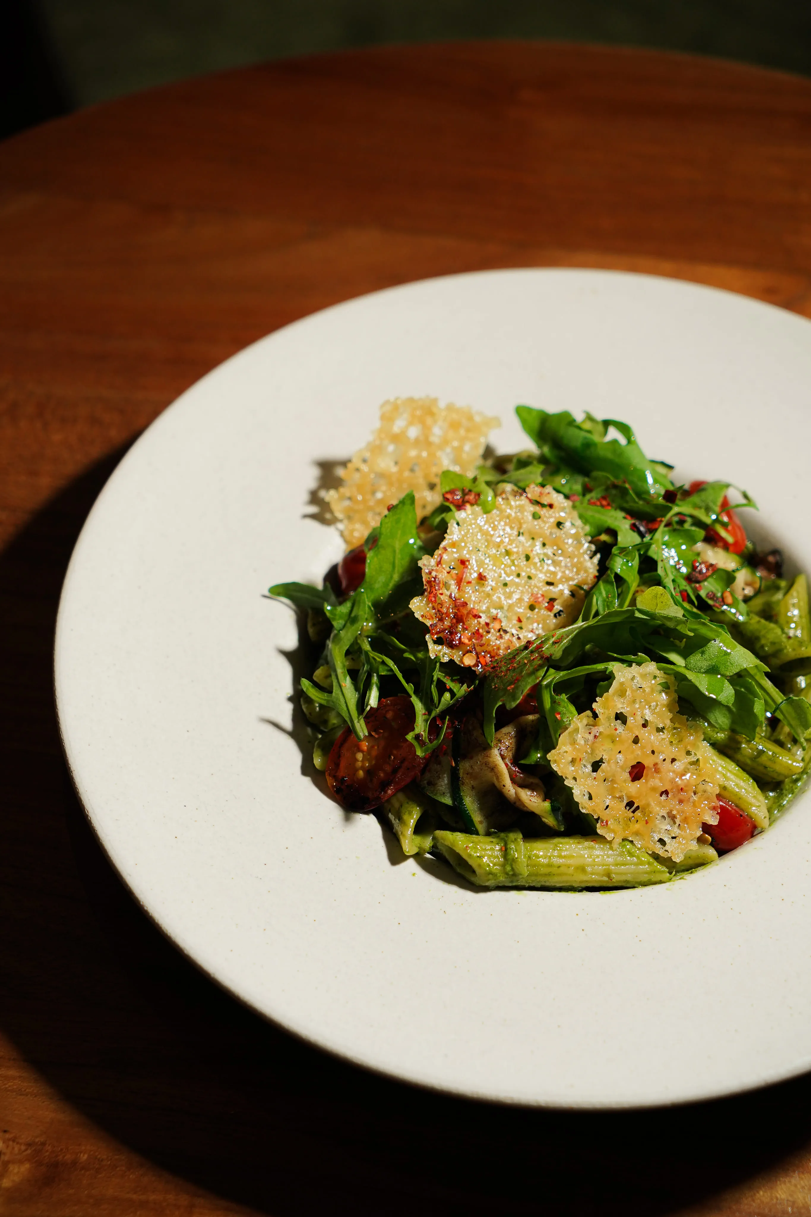 Penne in pesto sauce, grilled zucchini, cherry tomatoes, wild rocket, pine nuts, chili flakes and parmesan crisp