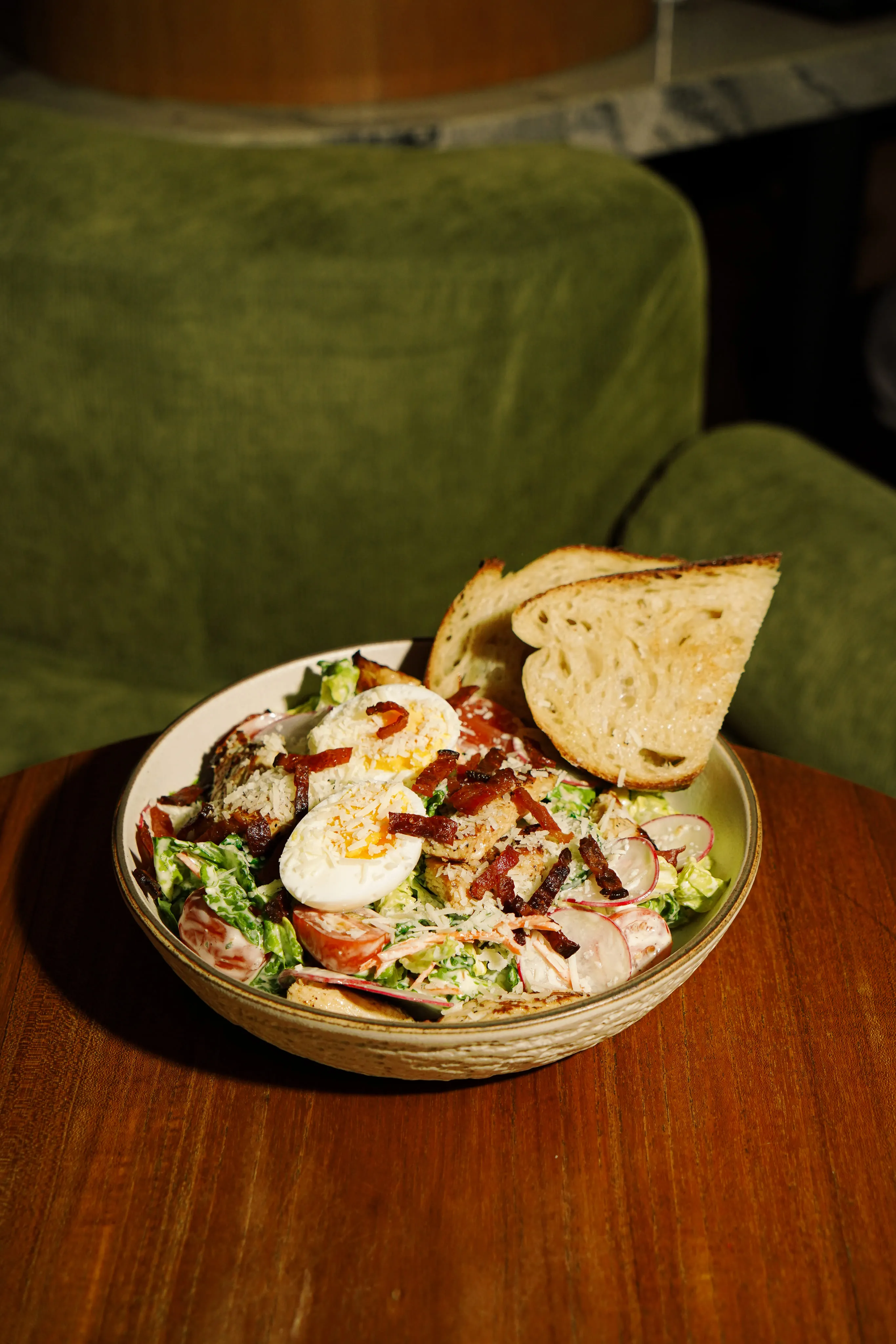 Pan seared chicken breast, cherry tomatoes, cucumber, romaine, radish, boiled egg, crispy pork bacon, parmesan, sourdough w/ gremolata