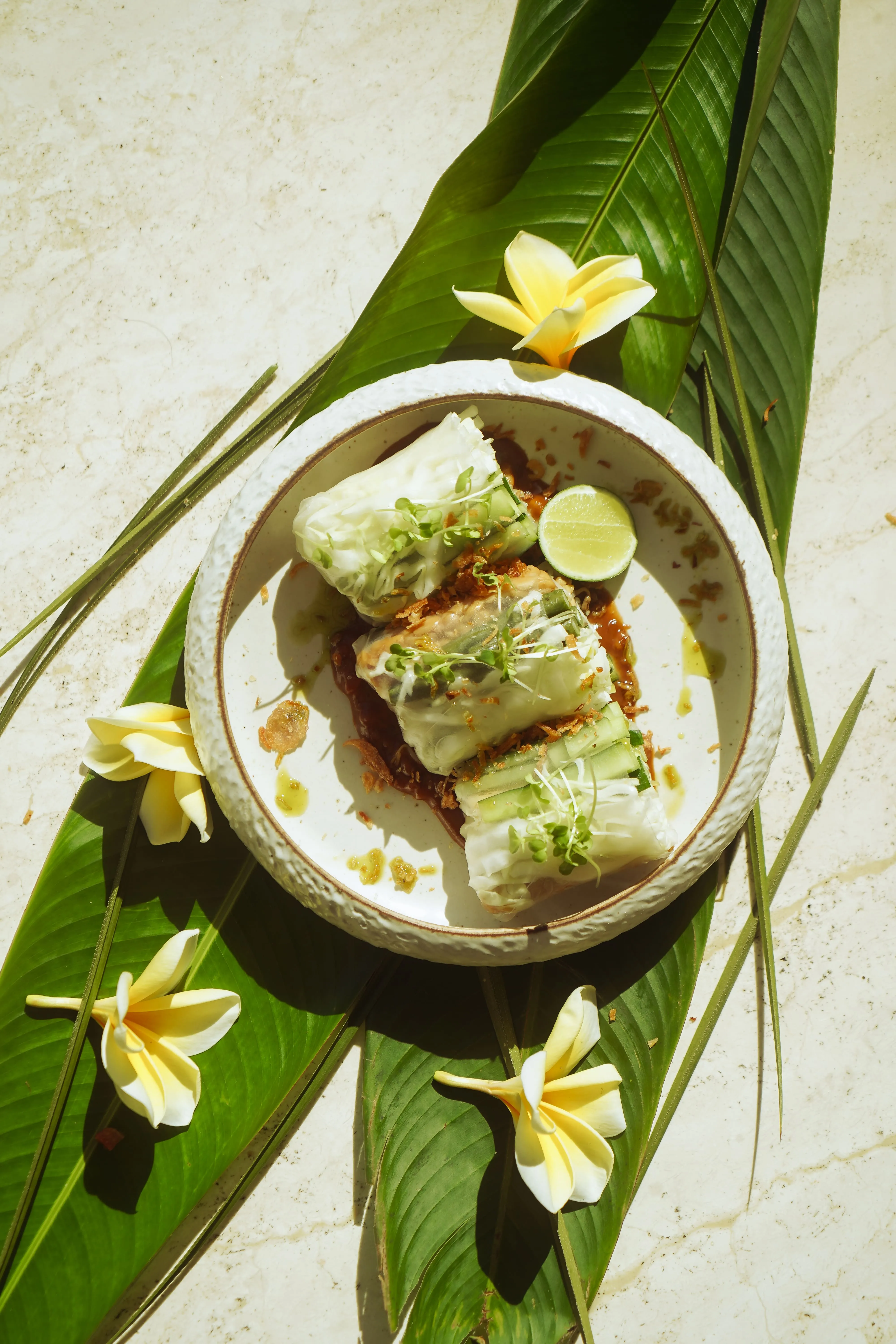 Rice paper, white cabbage, long bean, tempeh, tofu, cashew peanut sauce, bean sprouts, cucumber, lime, fried shallot, green oil